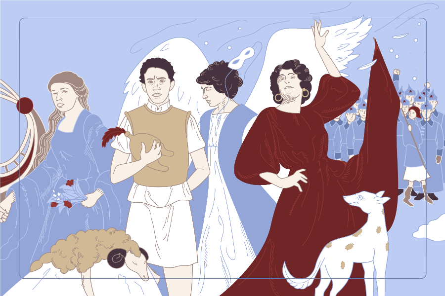 «Тревожный, ищущий, обворожительно кроткий, встретил Блок Пятый год. Помню, как Любовь Дмитриевна с гордостью сказала мне: “Саша нес красное знамя” — в одной из первых демонстраций рабочих. Помню, как значительно читал он стихотворение, только что написанное, где говорится о рыцаре на крыше Зимнего дворца, склонившем свой меч. Бродили в нем большие замыслы».