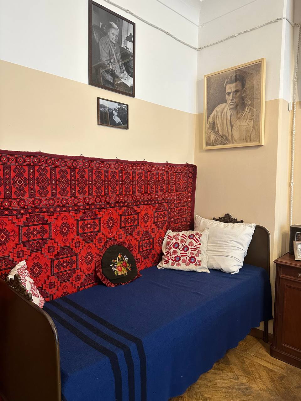 Понять, что первая комната принадлежит Александре Алексеевне, матери поэта, можно не по вещам, а по какой-то особой заботливой строгости, утешительной тишине. Сюда, по воспоминаниям родных, Маяковский приезжал в тяжелые периоды «отогреться под добрым материнским взглядом». Понять, что это за взгляд, позволяют фото на стене. Здесь усталость на лице матери отражается вместе со стойкостью — такой ее запомнили дети. Рядом — фото Владимира, та же прямая спина, те же тени у глаз.