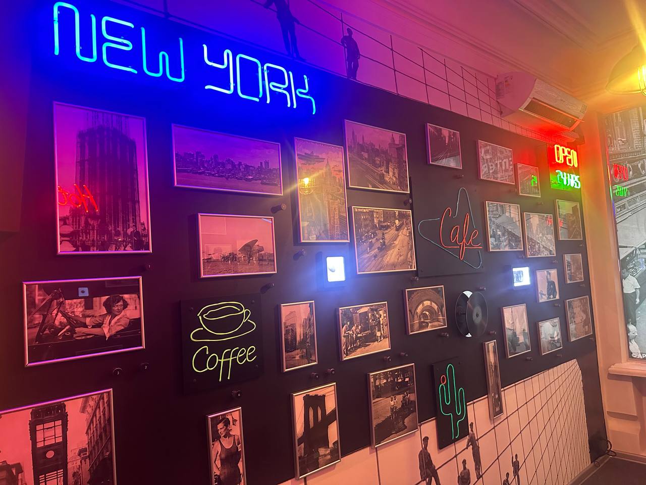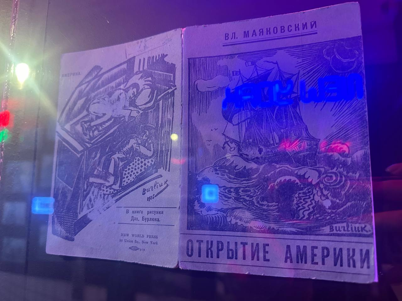 На стенах размещены обложки книг Владимира Маяковского «Америка» и «Открытие Америки». Эти издания представляют собой циклы очерков и стихов, написанных по итогам его поездки в США в 1925 году.