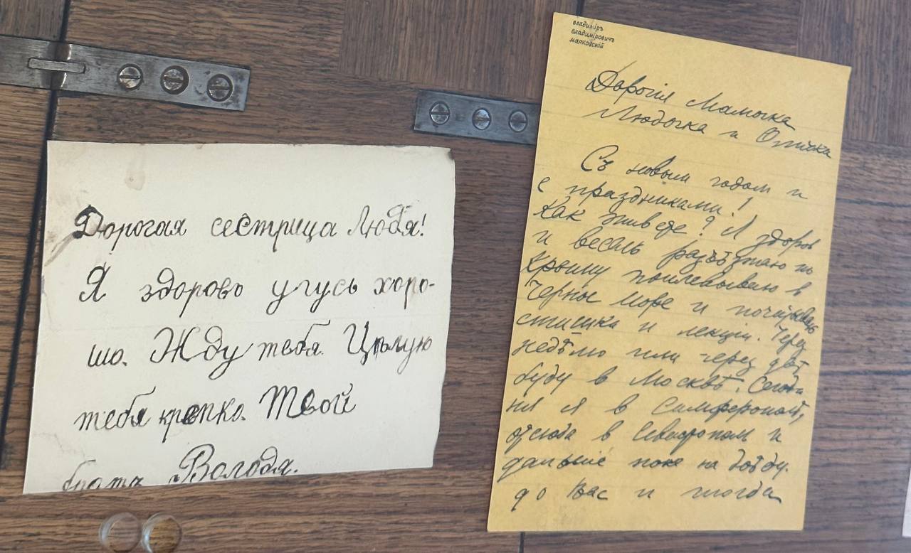 На столе разложены телеграммы, которые бережно хранила мать. Маяковский заботился о ней до конца своей жизни: «Страшно беспокоюсь за мамочку… Сейчас же поди на Сухаревку и купи маме от меня: 2 фунта белого хлеба, 1 фунт масла…», — писал он сестре Ольге. А в другом письме наказывал: «Послал десять червонцев… прошу ехать мягким вагоном».