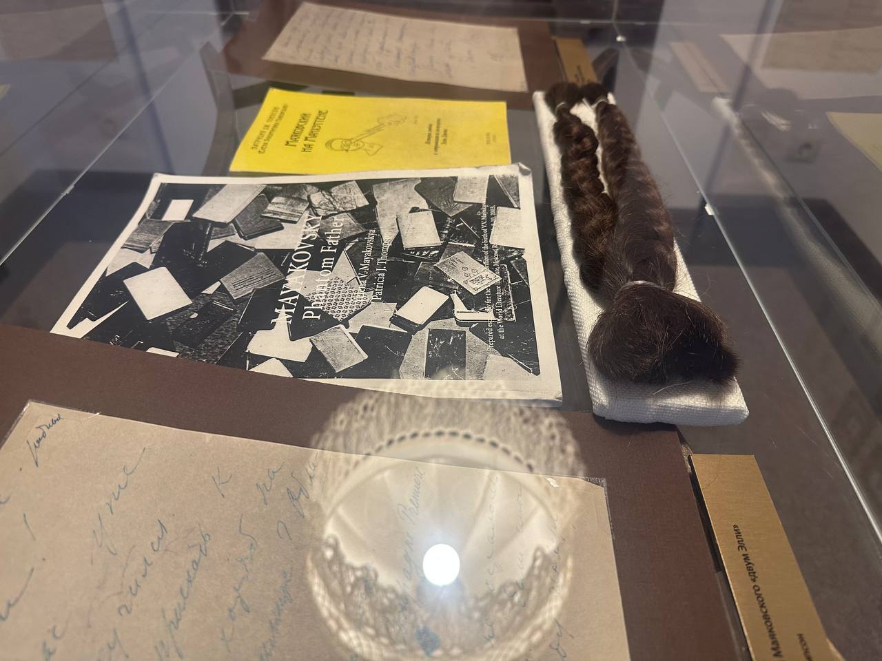 Был ли это мимолетный роман или большая любовь — сказать сложно, но то, что любовь была, экспонаты говорят нам точно. В витрине видим срезанные косы, так работники музея старались воссоздать историю того, как один из локонов Элли хранил у себя Маяковский. Если бы не любил — стал бы он беречь эту прядь?