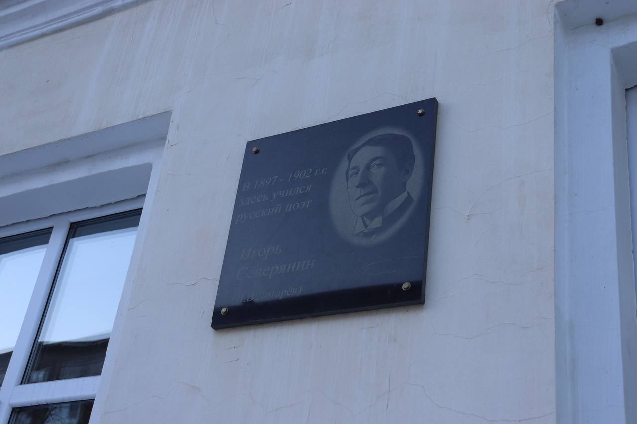 На мемориальной доске значится: «В 1897–1902 гг. здесь учился русский поэт Игорь Северянин (И.В. Лотарев)». Учился он, стоит сказать, неважно. Куда больше его занимали розыгрыши, литература и творческие изыскания. Он был уверен, что поэту нельзя учиться в «земной школе»,по-настоящему познать мир он может только «в лесу, горах, степях и в поле».