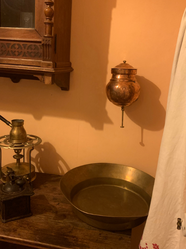 Когда Сергей Эфрон был дома, на кухне работал ретранслятор с черной тарелкой, расположенной на шкафу. Речь шла о политике — внутренней — и чуть меньше — о внешней. В остальное время устройство молчало. Марина Цветаева не любила его включать. Рядом с ретранслятором был расположен стол, за которым готовила Цветаева, тогда как второй, у окна, принадлежал Клепининой. Из аутентичной мебели здесь сохранились только стулья. На цветаевском столе, однако, можно найти предметы, которыми она пользовалась в 1939 году. Это мясорубка и медный тазик, с помощью которого делалось всё на свете: в нём варили, стирали, мыли, парили.