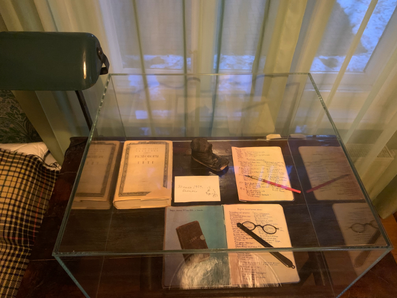 У Марины Цветаевой было достаточно плохое зрение, поэтому книги она читала исключительно с лорнетом. Записная книжка абсолютно пуста, задние страницы, на которых что-то было написано, — вырваны. В основном все записи, сделанные на даче, хранятся в болшевской тетради. Тут можно найти различные заметки на русском и французском языках, а также цветаевские переводы. Перевод — это, пожалуй, единственное, над чем она работала во время своего пребывания в Болшеве. Однажды ей поступил заказ от одной хорошей знакомой — перевести стихотворение Лермонтова на французский язык. Она так увлеклась, что перевела двенадцать его произведений. Если рассмотреть разворот тетради, представленный под витриной, то можно увидеть, как Цветаева начинала работу. Слева размещался текст на русском, а справа шел перевод.