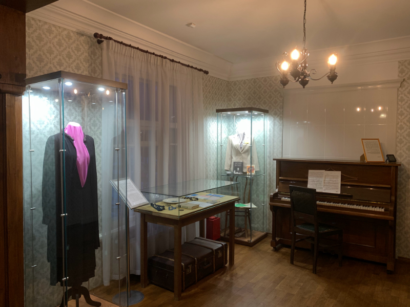 Что касается обстановки, то помещение сильно поменялось с 1939 года. Вместо камина здесь теперь стоит печка, появились занавески, которых раньше не было, и немецкое пианино. Этот инструмент Анастасия Цветаева подарила своей внучке, жившей в тот момент в Казахстане, Ольге Трухачевой. Из Казахстана он сюда и приехал. Как известно, мама Цветаевых была гениальной пианисткой. Она учила играть на фортепиано своих дочерей — Марину и Анастасию. После смерти матери Марина Цветаева прекратила играть, а вот Анастасия играла до тех самых пор, пока руки не прекратили её слушаться. Поэтому сразу за инструментом располагаются витрины, посвящённые жизни и творчеству младшей сестры поэта, писательницы Анастасии Цветаевой. Здесь можно увидеть её книги, письма, украшения и вещицы, связанные с её детством. Говоря об Анастасии Цветаевой, важно упомянуть, что в 1991 году она добилась того, чтобы Марину Цветаеву признали «доведённой до самоубийства».