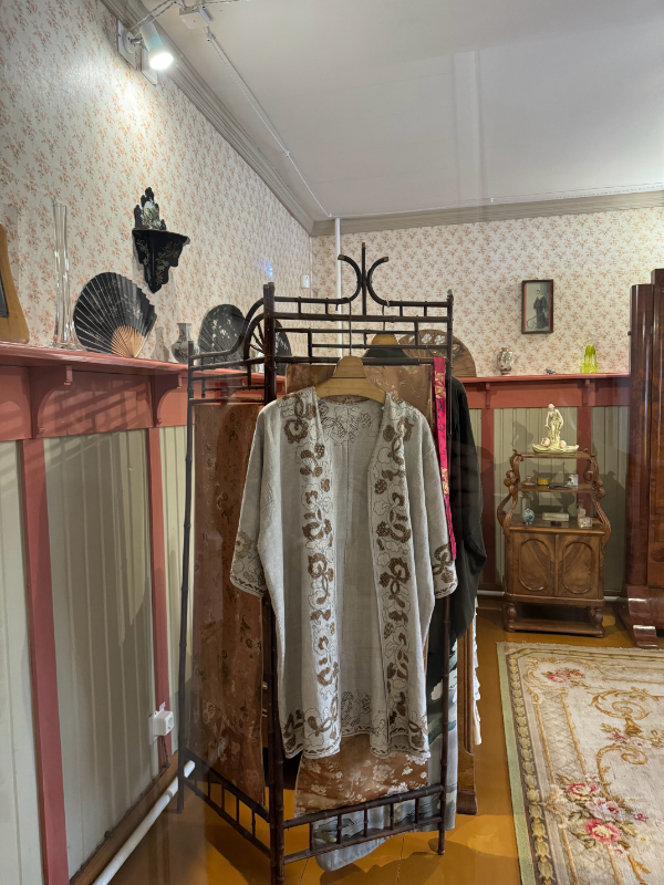 Комната Любови Дмитриевны находится на первом этаже пристройки. Сейчас здесь не так много подлинных вещей: только зеркало-псише, привезенное из петербургской квартиры, в которое смотрелась Любовь Дмитриевна, белое кашпо и сумочка. Веера по стенам, одежда и костюмы на вешалках — все это современная стилизация, попытка представить, как могла бы выглядеть комната Любови Дмитриевны, актрисы, выступавшей под фамилией Басаргина. Шахматово стало для нее домом в 1903 г. после ее свадьбы с Блоком.