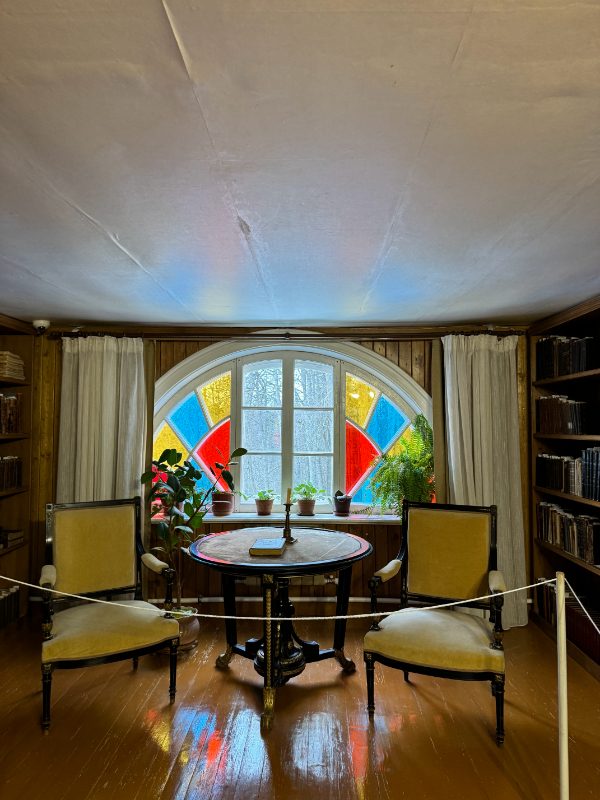 Соседняя комната, бывшая спальня младших сестер Александры и Марии Бекетовых, была в 1910 г. оборудована Блоком под библиотеку. Окна комнаты раскрасили в красный, желтый и синий цвет в стиле венецианских витражей. По воспоминаниям Марии Андреевны, стены украшали портреты любимых писателей Блока — Пушкина, Толстого и Достоевского (деталь эта сохранена и сейчас), а также привезенная из Парижа репродукция «Джоконды». 12 тысяч томов, которыми гордилась шахматовская библиотека, частично сгорели в 1921 г. либо были вывезены советской властью. Книги, что находятся в библиотеке сегодня, были подобраны по списку первого исследователя Шахматова П.А. Журова.